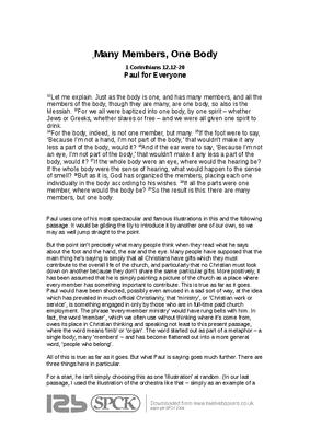 But the point isn’t precisely what many people think when they read what he says about the foot and the hand, the ear and the eye. Many people have supposed that the main thing he’s saying is simply that all Christians have gifts which they must contribute to the overall life of the church, and particularly that no Christian must look down on another because they don’t share the same particular gifts. More positively, it has been assumed that he is simply painting a picture of the church as a place where every member has something important to contribute. This is true as far as it goes. Paul would have been shocked, possibly even amused in a sad sort of way, at the idea which has prevailed in much official Christianity, that ‘ministry’, or ‘Christian work or service’, is something engaged in only by those who are in full-time paid church employment. The phrase ‘every-member ministry’ would have rung bells with him. In fact, the word ‘member’, which we often use without thinking where it’s come from, owes its place in Christian thinking and speaking not least to this present passage, where the word means ‘limb’ or ‘organ’. The word started out as part of a metaphor – a single body, many ‘members’ – and has become flattened out into a more general word, ‘people who belong’...