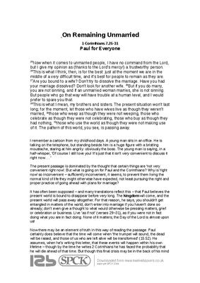 The present passage is dominated by the thought that certain things are ‘not very convenient right now’. But what is going on for Paul and the Corinthians? Why is ‘right now’ so inconvenient – sufficiently inconvenient, it seems, to prevent them living the normal kind of life they might otherwise have expected, not least pursuing the right and proper practice of going ahead with plans for marriage?...