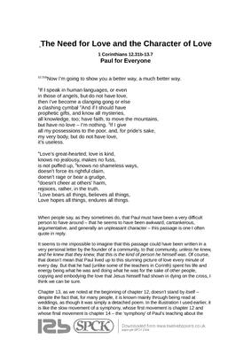 It seems to me impossible to imagine that this passage could have been written in a very personal letter by the founder of a community, to that community, unless he knew, and he knew that they knew, that this is the kind of person he himself was. Of course, that doesn’t mean that Paul lived up to this stunning picture of love every minute of every day. But that he had (unlike some of the teachers in Corinth) spent his life and energy being what he was and doing what he was for the sake of other people, copying and embodying the love that Jesus himself had shown in dying on the cross, I think we can be sure...