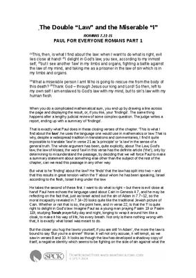 That is exactly what Paul does in these closing verses of the chapter. ‘This is what I find about the law’: he uses the language one would use in mathematics or law. That is why, despite a widespread tradition in translations and commentaries, I find it quite impossible to translate ‘law’ in verse 21 as ‘a principle’ or ‘a law’ in the sense of a general truth. The whole argument has been, quite explicitly, about The Law, God’s law, the law of Moses; the word ‘law’ in this verse has the definite article (‘the’); only by determining to misunderstand the passage, by deciding that we will force Paul to make a summary statement about something else other than the subject of the rest of the chapter, can we read this passage in any other way...