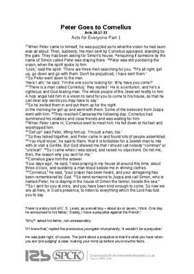 ‘Four days ago’, he said, ‘I was praying in my house at around this time, about three o’clock, and suddenly a man stood beside me in shining clothes. 31“Cornelius,” he said, “your prayer has been heard, and your almsgiving has been remembered by God. 32So send someone to Joppa and call Simon, who is named Peter; he is staying in the house of Simon the tanner, beside the sea.” 33So I sent for you at once, and you have been kind enough to come. So now we are all here, in God’s presence, to listen to everything which the Lord has told you to say...