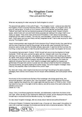 The second main petition in the Lord’s Prayer – ‘Thy Kingdom Come’ – rules out any idea that the kingdom of God is a purely heavenly (that is, ‘otherworldly’) reality. Thy kingdom come, we pray, thy will be done, on earth as it is in heaven. Sort out the familiar, but technical, terms. ‘Heaven’ and ‘earth’ are the two interlocking arenas of God’s good world. Heaven is God’s space, where God’s writ runs and God’s future purposes are waiting in the wings. Earth is our world, our space. Think of the vision at the end of Revelation. It isn’t about humans being snatched up from earth to heaven. The holy city, new Jerusalem, comes down from heaven to earth. God’s space and ours are finally married, integrated at last. That is what we pray for when we pray ‘Thy kingdom come’...