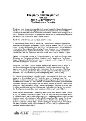 The Jesus-meal (to use an unusual though neutral phrase for it) was already woven into the heart of Christian living by the time Paul wrote to Corinth in the mid-50s, twenty years or so after Jesus’ death and resurrection. It held such a strong place in Paul’s own thinking that he could speak of the very action of the meal as proclaiming the death of the Lord until he comes. Doing it said it…
