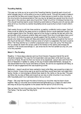 On following weeks we would suggest that the candle is lit by the person/people who is/are Journeying with Mary and Joseph and the figures brought to the front of the church at that point. Where singing a verse of a hymn is suggested, this hymn could be either 'The Holy and the Ivy' or another progressive carol.