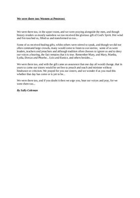 We were there too, in the upper room, and we were praying alongside the men, and though history renders us mostly nameless we too received the glorious gift of God's Spirit. Her wind and fire touched us, filled us and transformed us too…