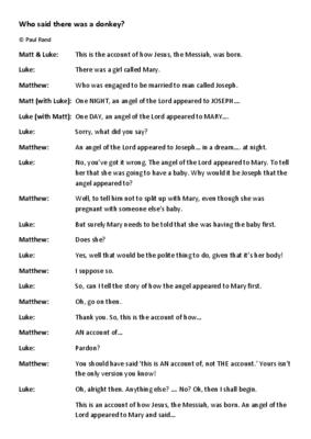 The play starts with Matthew and Luke saying together "This is the account of how Jesus, the Messiah, was born." but they soon realise that their accounts are not the same.
