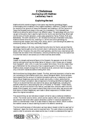 Matthew’s birth narrative begins in the same way that the genealogy began. Unfortunately this is masked in the English translation. Matthew 1.1 begins ‘a book [or record] of the genesis of Jesus the Messiah’ and Matthew 1.18 ‘the genesis of Jesus the Messiah took place in this way’ (my translation). This indicates that Matthew is doing the same thing in two different ways. The genealogy tells you how we got to this point, that it was the right time for God to act and that Mary fitted well into the story of God’s salvation, a story also peopled by Tamar, Rahab, Ruth and Bathsheba. The birth narrative in 1.18 –25 tells how this act of salvation took place. Matthew further links the two, reaching in 1.16 the end of the genealogy by mentioning first Joseph, then Mary, then Jesus, and in 1.18 reversing that pattern by mentioning Jesus, then Mary and finally Joseph...